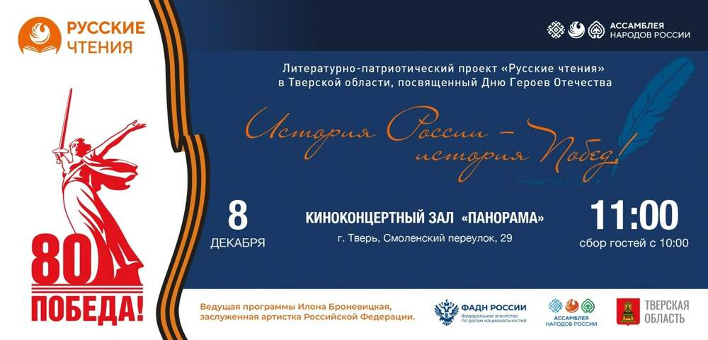 8 декабря в Твери, в киноконцертном зале «Панорама», начнет свою работу программа «Русские чтения: «История России – история Побед». По данным отдела информации и аналитики Администрации города Твери, этот всероссийский литературно-патриотический проект, получивший поддержку Федерального агентства