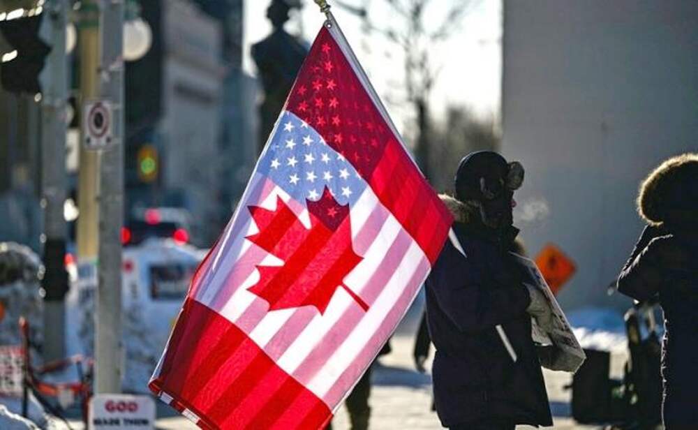 На фото: протестующий держит флаги Канады и США на Парламентском холме в Оттаве. (Фото: Justin Tang/The Canadian Press via ZUMA Press/TASS)