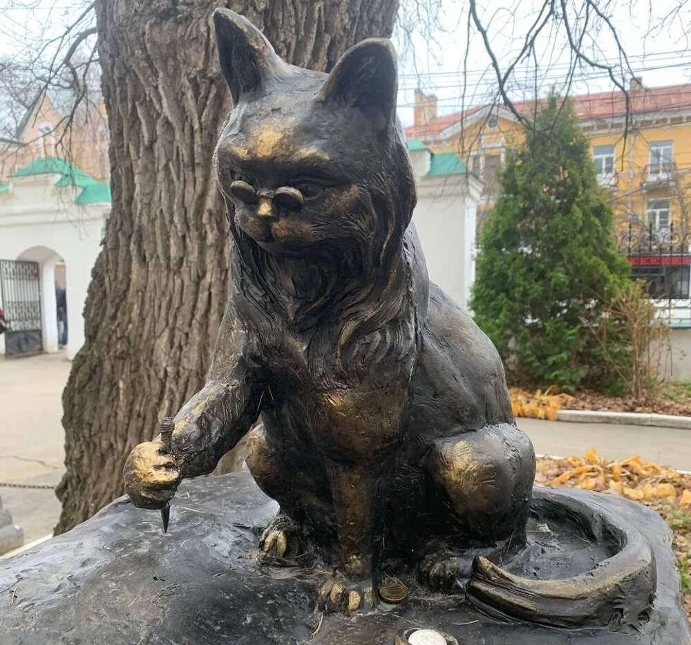 Бронзовая скульптура «Кот учёный» была установлена в честь одноимённого литературного персонажа поэмы «Руслан и Людмила» Александра Пушкина. Неизвестные сломали скульптуру «Кота учёного» на территории РГУ имени С.А. Есенина. Об этом РИА «7info» сообщили подписчики. У арт-объекта сломано перо,