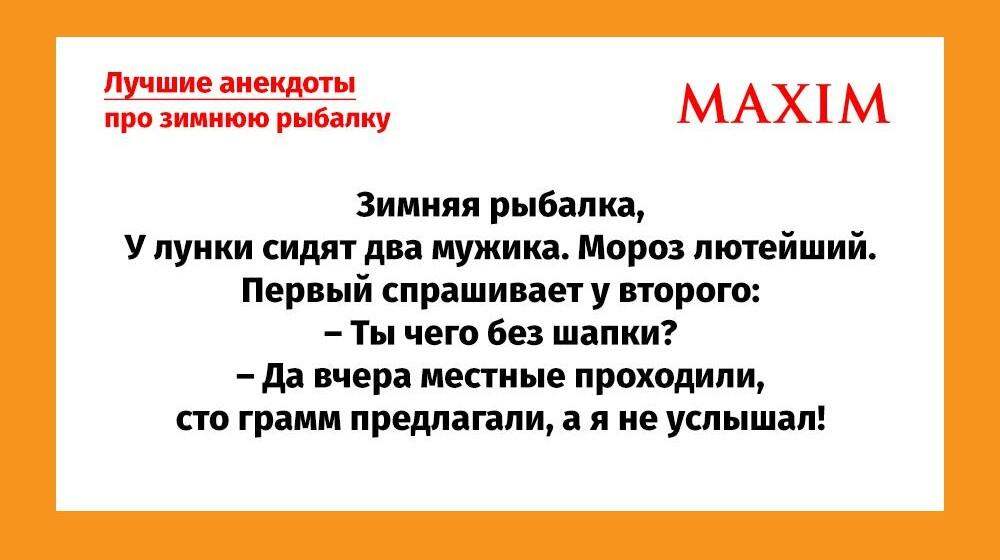 Ну, с нашим днем, мужики! День зимней рыбалки сегодня. В подарок вам MAXIM выудил самые клевые и смешные анекдоты на эту тему. Если у вас сегодня ощущение, будто что-то наклевывается, то не зря: 8 февраля — День зимней рыбалки. MAXIM бился как рыба об лед, но наудил вам в подарок самые клевые и... Далее