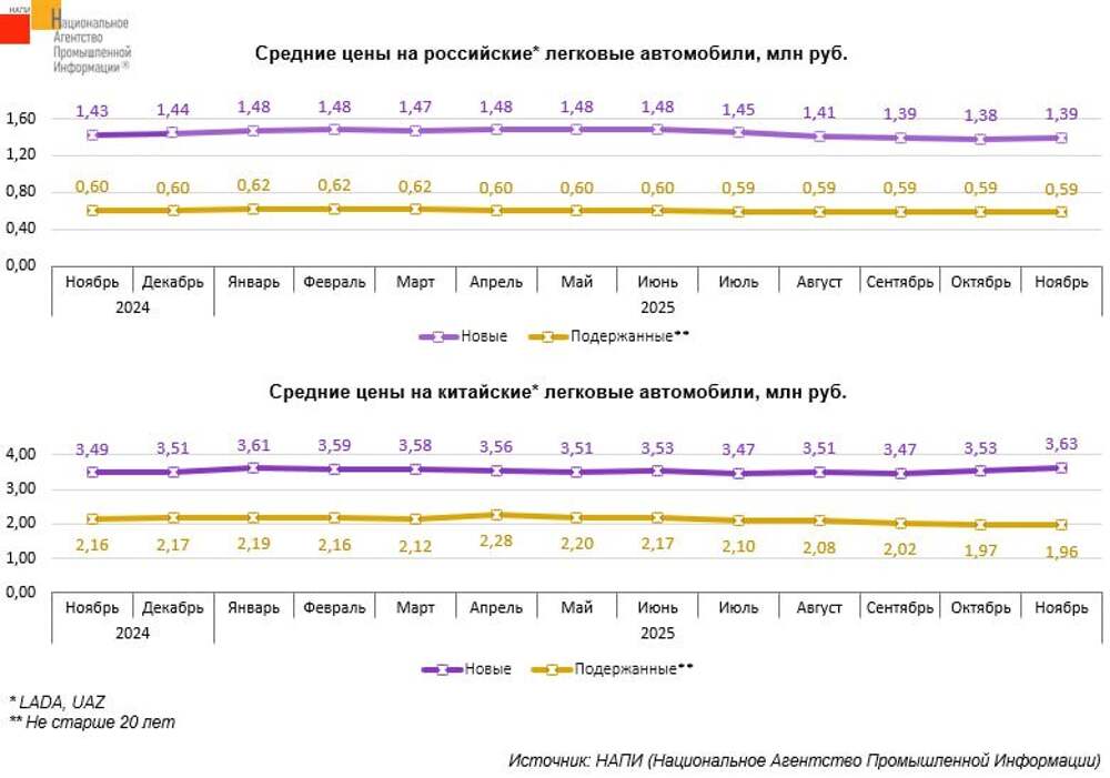 Маркетинговое агентство НАПИ проанализировало динамику средних цен на новые и подержанные легковые автомобили. За год, с ноября 2024 по ноябрь 2025 года, средняя цена на новые автомобили LADA и UAZ снизилась на 2,7%,