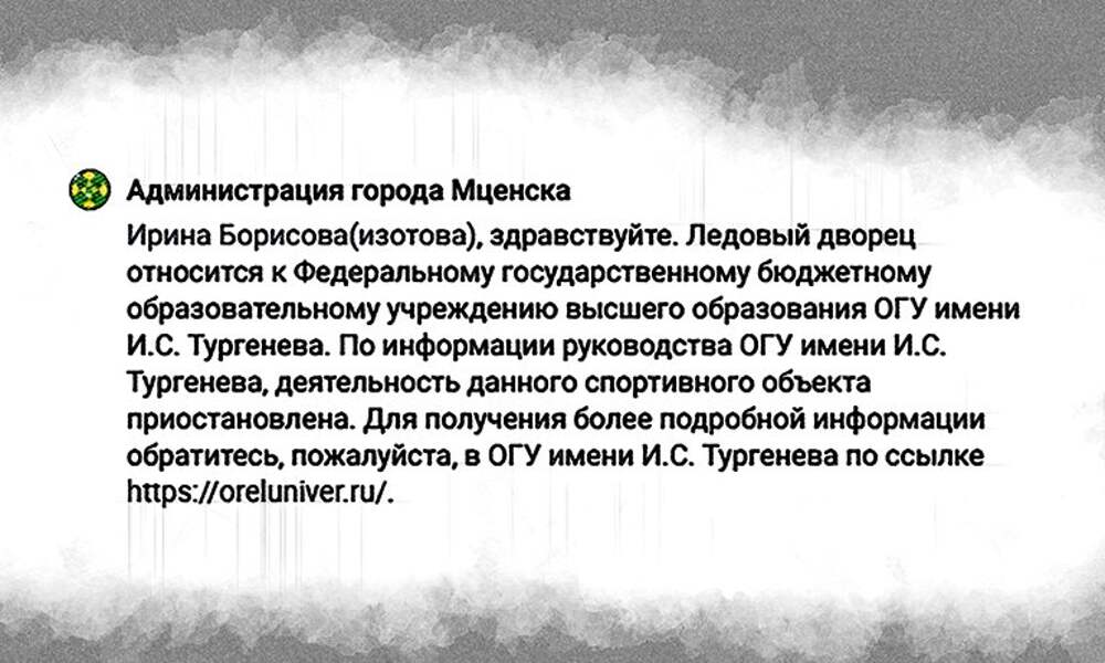 О такой вероятности заявила Администрация Мценска. На прошлой неделе стало известно, что в Мценске закрыли Ледовой дворец. Это единственное, по сообщению амчан, место, где дети могли покататься на коньках. Тогда в местной администрации пояснили, что спортобъект относится к ОГУ имени И.С. Тургенева... Далее