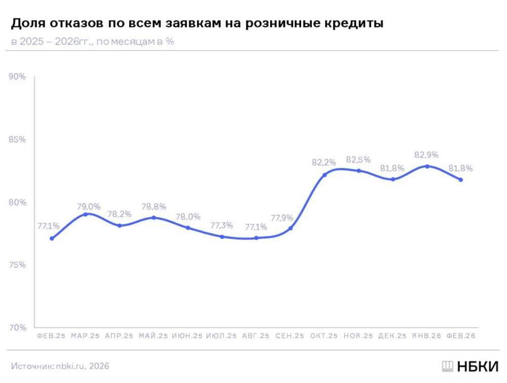 📶 НБКИ: В феврале 2026 года доля отказов по всем заявкам на розничные кредиты составила 81,8%. По сравнению с предыдущим месяцем доля снизилась на 1,1 п.п. (в январе - 82,9%). При этом в последние четыре месяца, снова отметил НБКИ, показатель стабилизировался на уровне 81-83%. "Банки, в... Далее