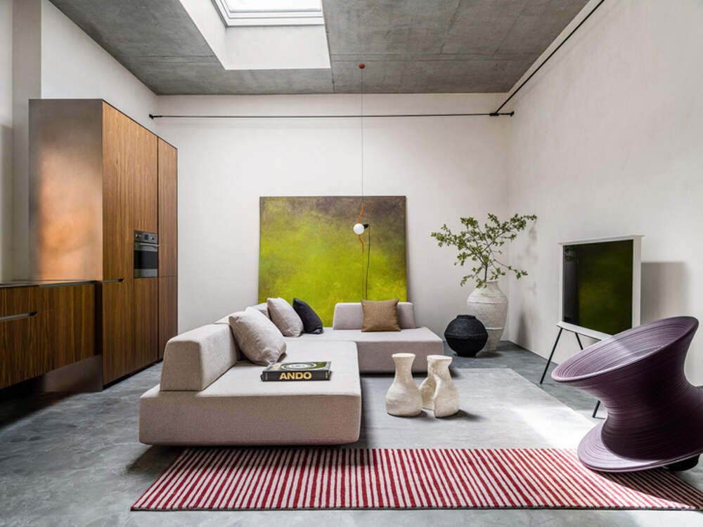 В гостиной привлекают внимание диван и торшер от Bonaldo, а также вращающееся кресло-аттракцион. Диван от Massimo дополняет обстановку. Центральным элементом стал керамический стол авторства художницы Оксаны Панфиловой. Пространство украшает ковер ручной работы из Индии, созданный по эскизам Анны... Далее