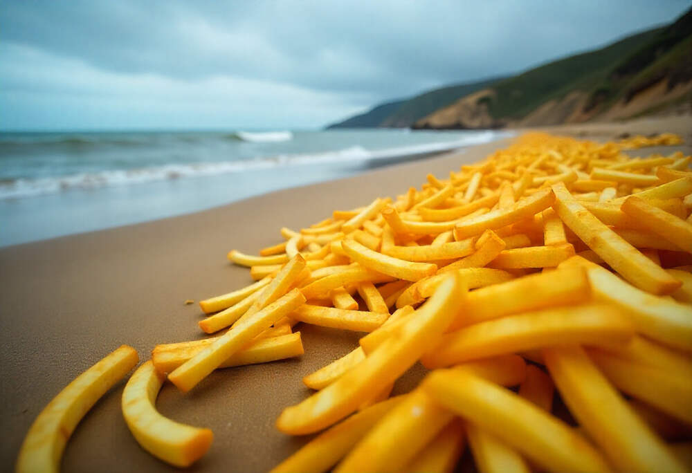 Британский пляж завалило тоннами картофеля фри после шторма