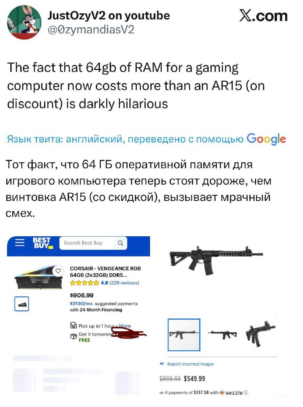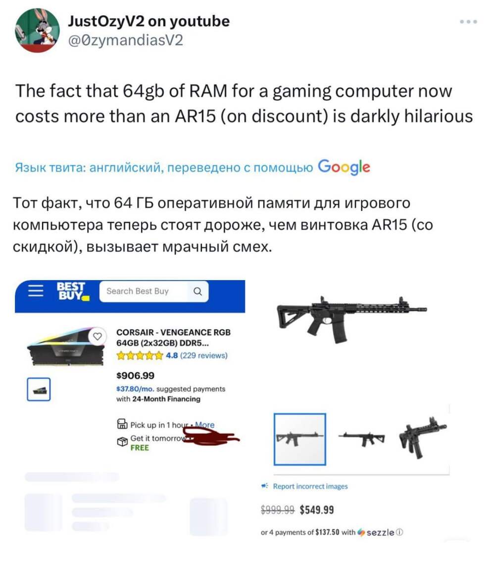 Ничего необычного, просто винтовка AR15 в США стоит дешевле, чем 64 ГБ памяти DDR5. 2026 год обещает быть весёлым. @exploitex