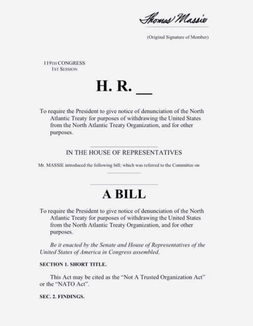 Конгрессмен-республиканец Томас Масси представил законопроект о выходе США из НАТО, пресс-релиз размещен на сайте палаты Предусматривается полный запрет на использование средств для бюджетов альянса. "Мы должны выйти из НАТО и использовать эти деньги для защиты нашей собственной страны, а не... Далее