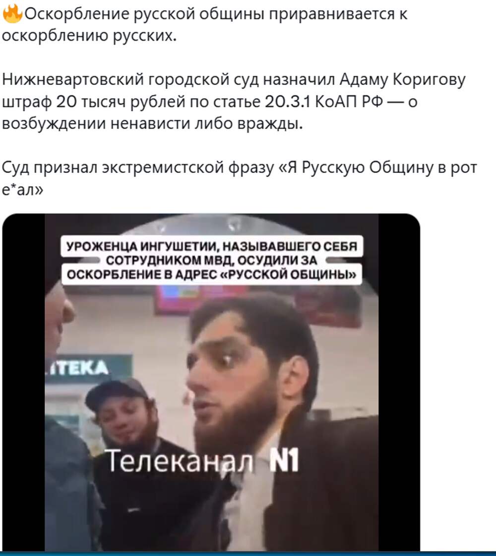 Прославившийся на весь Нижневартовск (ХМАО) Адам Коригов, который напал на покупателя на кассе в «Магните», получил ещё один приговор. Его осудили за разжигание ненависти и оскорбительные высказывания в адрес «Русской Общины» и назначили... Далее