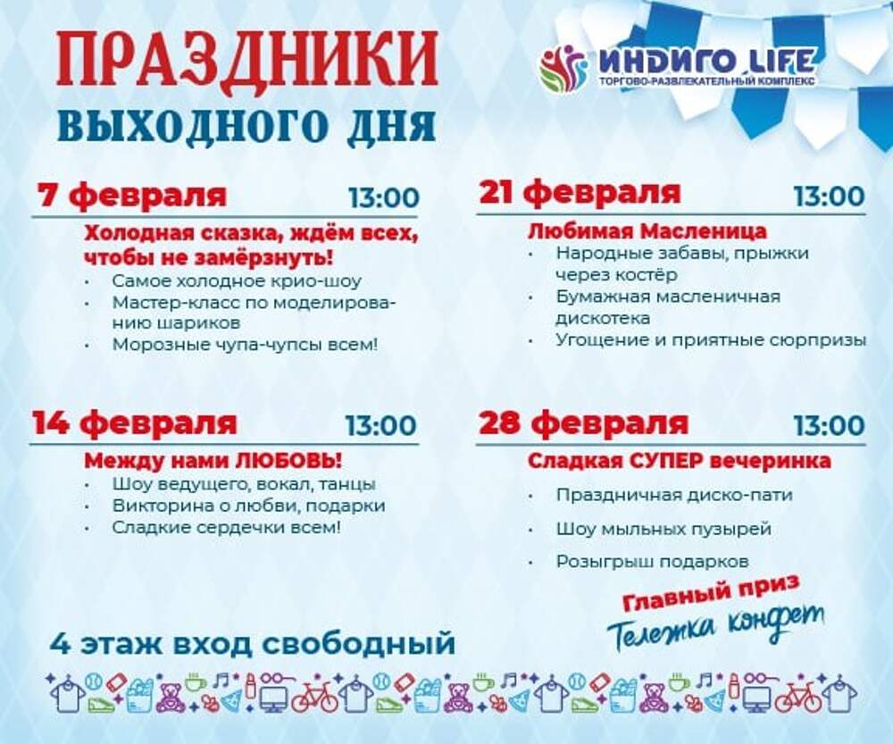 Детские праздники выходного дня в феврале ⏰14, 21 и 28 февраля (сб), в 13:00 📍ТРК «Индиго Life», Казанское шоссе, 11, 4 этаж 💵Вход свободный 14 февраля - Между нами любовь! 🔹Шоу ведущего, вокал, танцы 🔹Викторина о любви, подарки 🔹Сладкие сердечки всем 21 февраля - Любимая... Далее