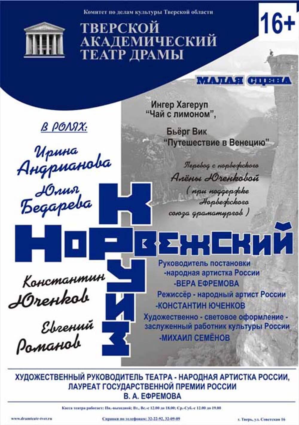 30 января в 19:00 на сцене Тверского Академического Театра Драмы состоится особенный вечер, посвященному светлой памяти народной артистки России Ирины Андриановой, автора проекта «Театр на экране». В рамках мероприятия состоится видеопоказ спектакля «Норвежский круиз» и пройдет творческая встреча с... Далее