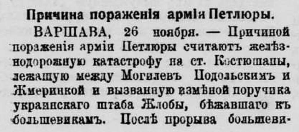 Причины поражения армии Петлюры. Варшава, 26 ноября. Причиной поражения армии Петлюры считают железнодорожную катастрофу на станции Костюшаны лежащую между Могилев-Подольским и Жмеринкой и вызванную изменой поручика украинского штаба Жлобы, бежавшего к большевикам. После прорыва большевиками фронта