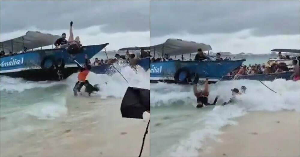На маленьком острове Джонни Кей у побережья Колумбии женщина упала с экскурсионной лодки в бурное море. Видео показывает, как лодка раскачивается, а туристку внезапно выбрасывает с носа судна — она ударилась спиной о песок, получив перелом позвоночника. ... Далее