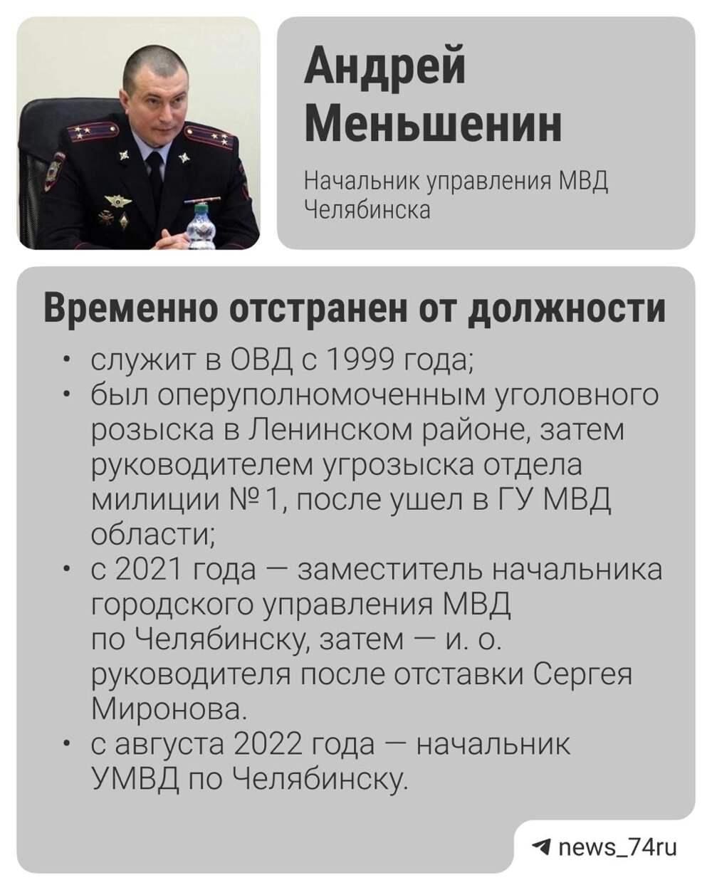 ⚡️ Начальника управления МВД Челябинска Андрея Меньшенина временно отстранили от должности