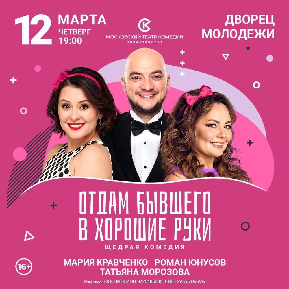 💪12 марта в Екатеринбурге пройдёт спектакль Московского театра комедии «Отдам бывшего в хорошие руки» 16+ 🌟Мария Кравченко 🌟Роман Юнусов 🌟Татьяна Морозова 🏛️Дворец молодежи, пр. Ленина, д. 1 🗓️12 марта (четверг) в 19:00 💵от 960₽ вместо 1200₽ 👉Купить билеты по ссылке ... Далее
