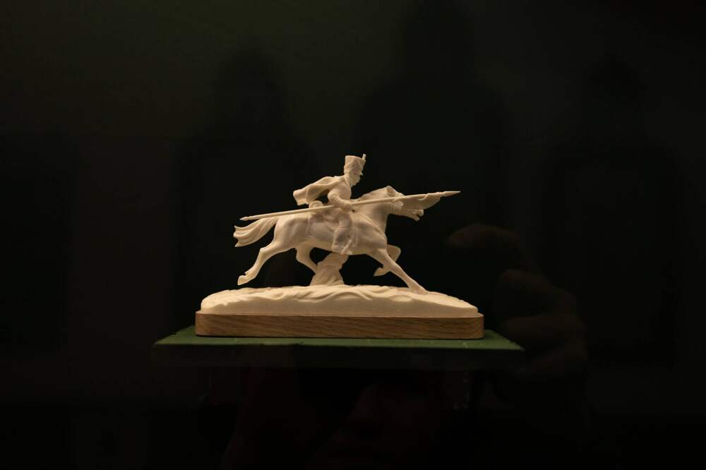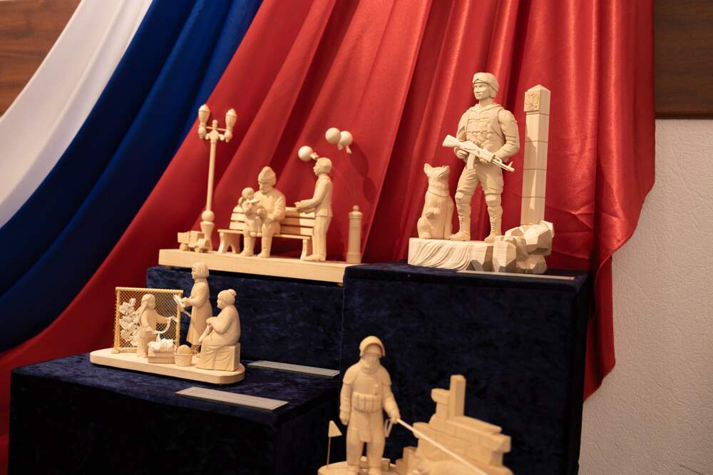 Огромные резные фигуры от резчика, чемпиона мира по скоростной резьбе по дереву Владимира Алманова, или, например, уникальный кованый поднос «Триумф Победы» в традициях нижнетагильского