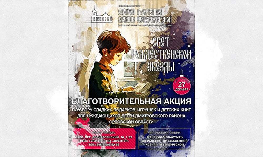 В Орле начался сбор подарков для традиционной благотворительной акции «Свет Рождественской звезды». Цель мероприятия — поздравить с Рождеством Христовым детей из нуждающихся семей Дмитровского района. Акция, которая проводится с 2014 года, организуется монастырём во имя блаженной Ксении