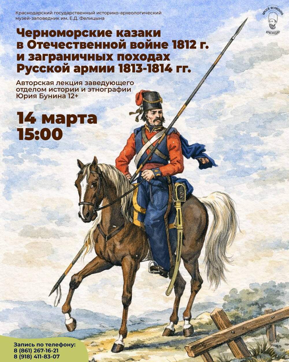 📅 14 марта | 15:00 В музее им. Е.Д. Фелицына состоится авторская лекция «Черноморские казаки в Отечественной войне 1812 г. и заграничных походах Русской армии 1813–1814 гг.». Лекцию проведёт заведующий отделом истории и этнографии Юрий Бунин. Вы узнаете: 🔹 какую роль сыграли... Далее