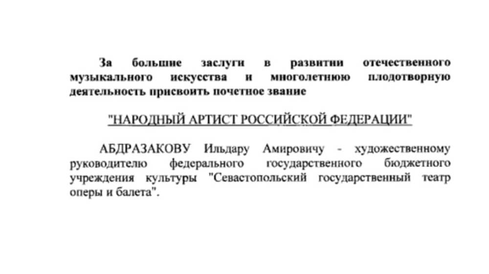 Президент России Владимир Путин присвоил звание народного артиста России художественному руководителю Севастопольского театра Ильдару Абдразакову. В указе президента России отмечаются большие заслуги Абдразакова в развитии отечественного музыкального искусства и многолетняя плодотворная... Далее