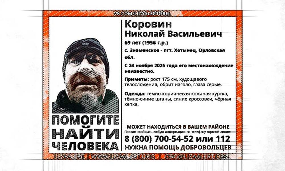 Ещё один человек пропал в Орловской области. На этот раз поисковики опубликовали ориентировку на 69-летнего Николая Васильевича Коровина, которого не могут найти с 24 ноября. Как сообщил поисковый отряд «ЛизаАлерт», мужчина проживает в селе Знаменское Хотынецкого района Орловской области, однако