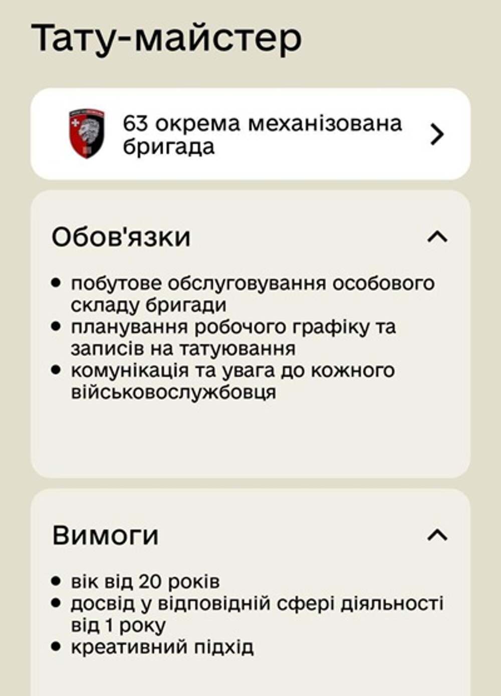 63-я отдельная механизированная бригада (ОМБр) ВСУ, величающая себя «Стальными львами», разместила в соцсетях объявление о поиске для «бытового обслуживания личного состава» парикмахера, тату-мастера и массажиста, сообщает «Страна.ua».