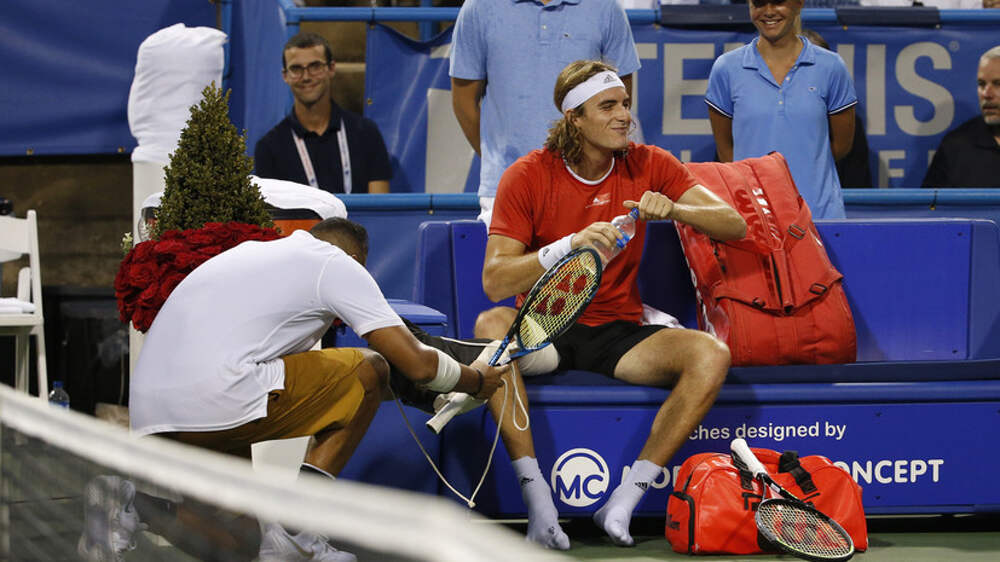 Кирьос принёс запасные кроссовки Циципасу и вручил их сопернику, став на одно колено