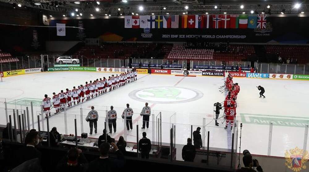 Организационные казусы и Чайковский вместо гимна как неожиданность для россиян На стартовый матч чемпионата мира с чехами российская команда, как и на корейской Олимпиаде 2018, вышла под видом некой командой ОКР — без флага и гимна. «Атлеты из России». Что примечательно, на англоязычных табло и