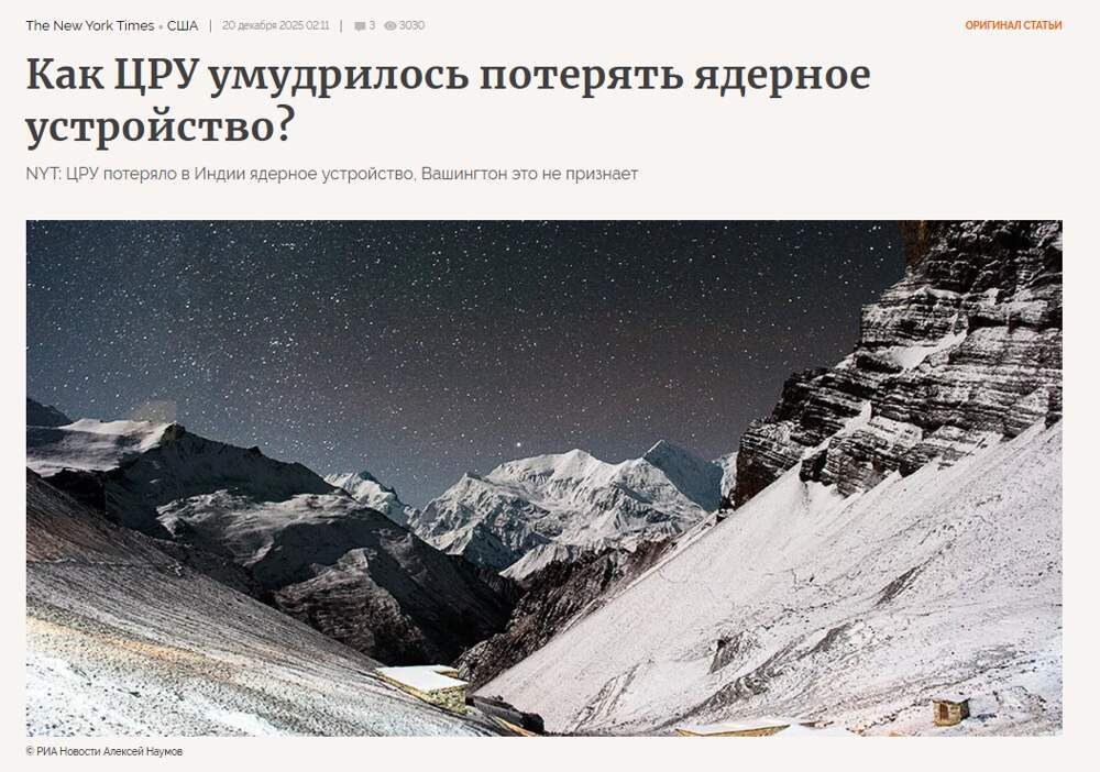 В 1965 году нанятая ЦРУ группа альпинистов пыталась установить на одной из вершин в индийских Гималаях устройство слежения за военными объектами Китая. Однако этот прибор, работающий на радиоактивном топливе, был потерян и до сих пор не найден, выяснила The New York Times.