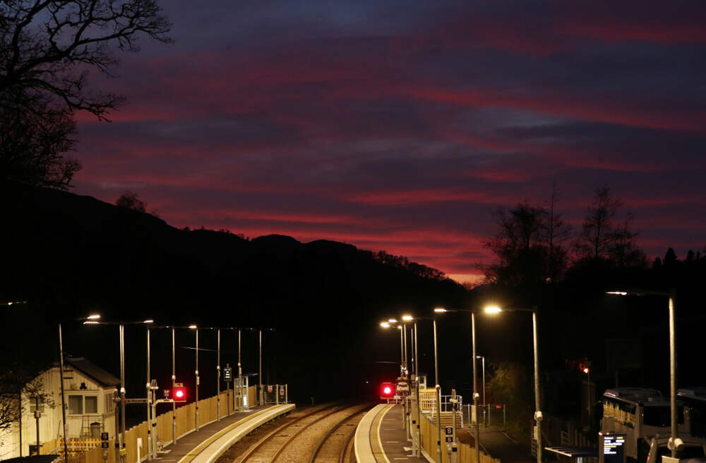 Небо окрасилось в ярко-розовый цвет во время снежной бури