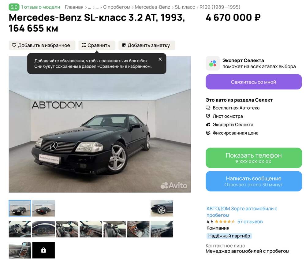 В России выставлен на продажу редкий Mercedes-Benz SL-класс 3.2 AT 1993 года выпуска, поколение R129 (1989—1995), с пробегом 164 655 км. Продавец в своем объявлении на площадке Авито подчёркивает, что автомобиль не был в авариях, все элементы окрашены заводским лаком, сохранился оригинальный... Далее