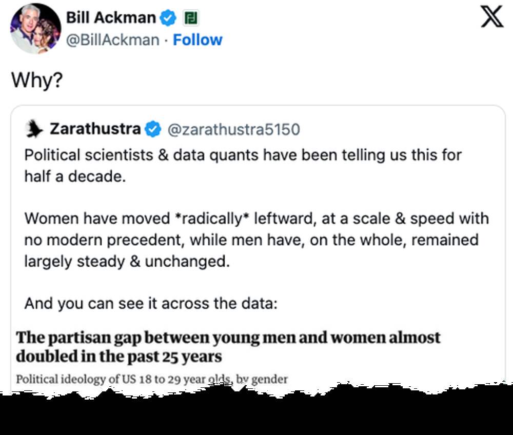Why Young Women Moved Left While Young Men Stayed Sane Authored by vittorio on X, Bill Ackman quote-tweeted a graph showing the partisan gap between young men and women almost doubled in 25 years. Political scientists & data quants have been telling us this for half a decade.... Далее