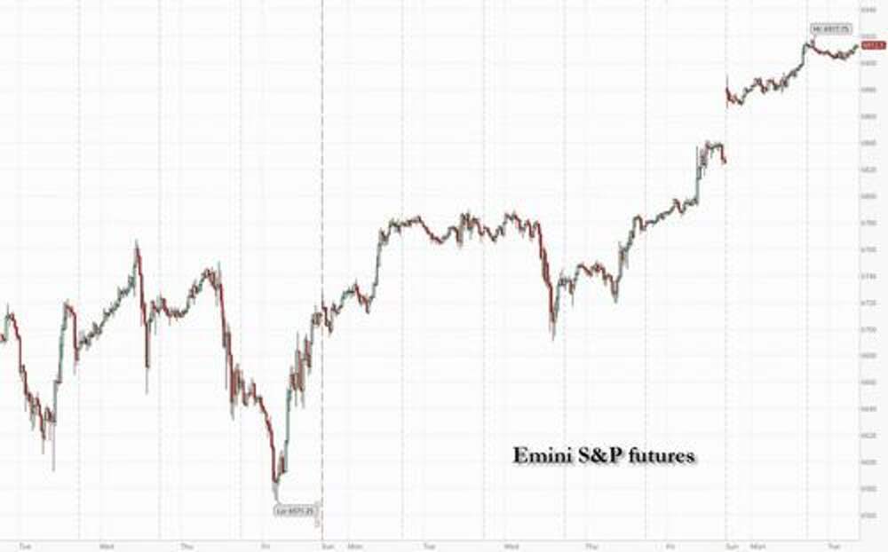 The record-busting stock rally paused ahead of two huge days which include an avalanche of Mag7 earnings, central bank meetings, and the Trump-Xu summit summit. As of 8:00am ET, S&P 500 futures are flat with Nasdaq futures up 0.1%